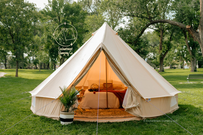 Experience luxury camping with Enchantment Glamping Co. Your package includes a fully set up 16-foot diameter white canvas Bell Tent equipped with a deluxe rug, comfortable elevated queen-size bed(s) complete with all necessary linens, comforters, pillows, side tables, chairs, and ample lighting. Electricity is available for low-power devices, and there is a nearby porta-potty and daily turndown service. Upon check-in, a credit card is required for a $200 damage deposit. Rentals only. Entry tickets are purchased separately.
